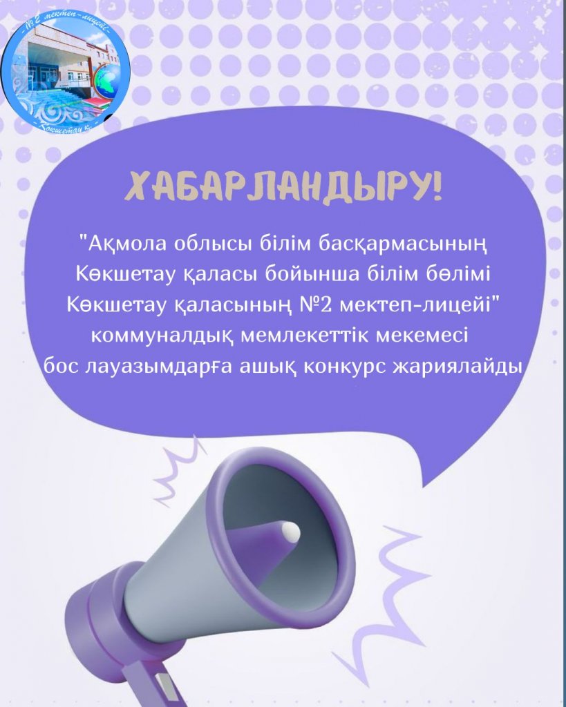 «Ақмола облысы білім басқармасының Көкшетау қаласы бойынша білім бөлімі Көкшетау қаласының № 2 мектеп-лицейі» КММ «Мемлекеттік білім беру ұйымдарының бірінші басшылары мен педагогтерін лауазымға тағайындау, лауазымнан босату қағидаларын бекіту туралы» Қазақстан Республикасы Оқу-ағарту министрінің 2025 жылғы 31 наурыздағы № 57 және Қазақстан Республикасы Еңбек және халықты әлеуметтік қорғау министрінің 2025 жылғы 31 наурыздағы № 96 бірлескен бұйрығына сәйкес педагогтердің бос немесе уақытша бос лауазымына орналасуға конкурс жариялайды: