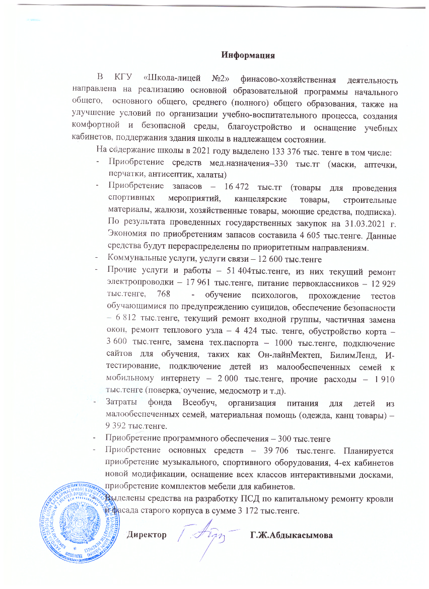 Информация о расходовании средств КГУ "Средняя школа-лицей №2" отдела образования г.Кокшетау