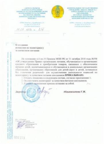 Мектепте тамақтандыруды ұйымдастыру туралы бұйрық