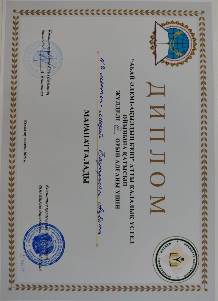 Мақсаты:қызықты үстел ойыны арқылы Абай Құнанбайұлының бай мұрасын насихаттау,өмірбаяны,өлеңдері мен қарасөздері туралы білімдерін кеңейту,жылдам ойлап,дұрыс шешім қабылдауға үйрету.Аталмыш үстел ойынына №2 мектеп-лицейінің 10"А" сынып оқушысы Бауыржан Ақбота қатысып,нәтижесінде 3-орынды иеленді.