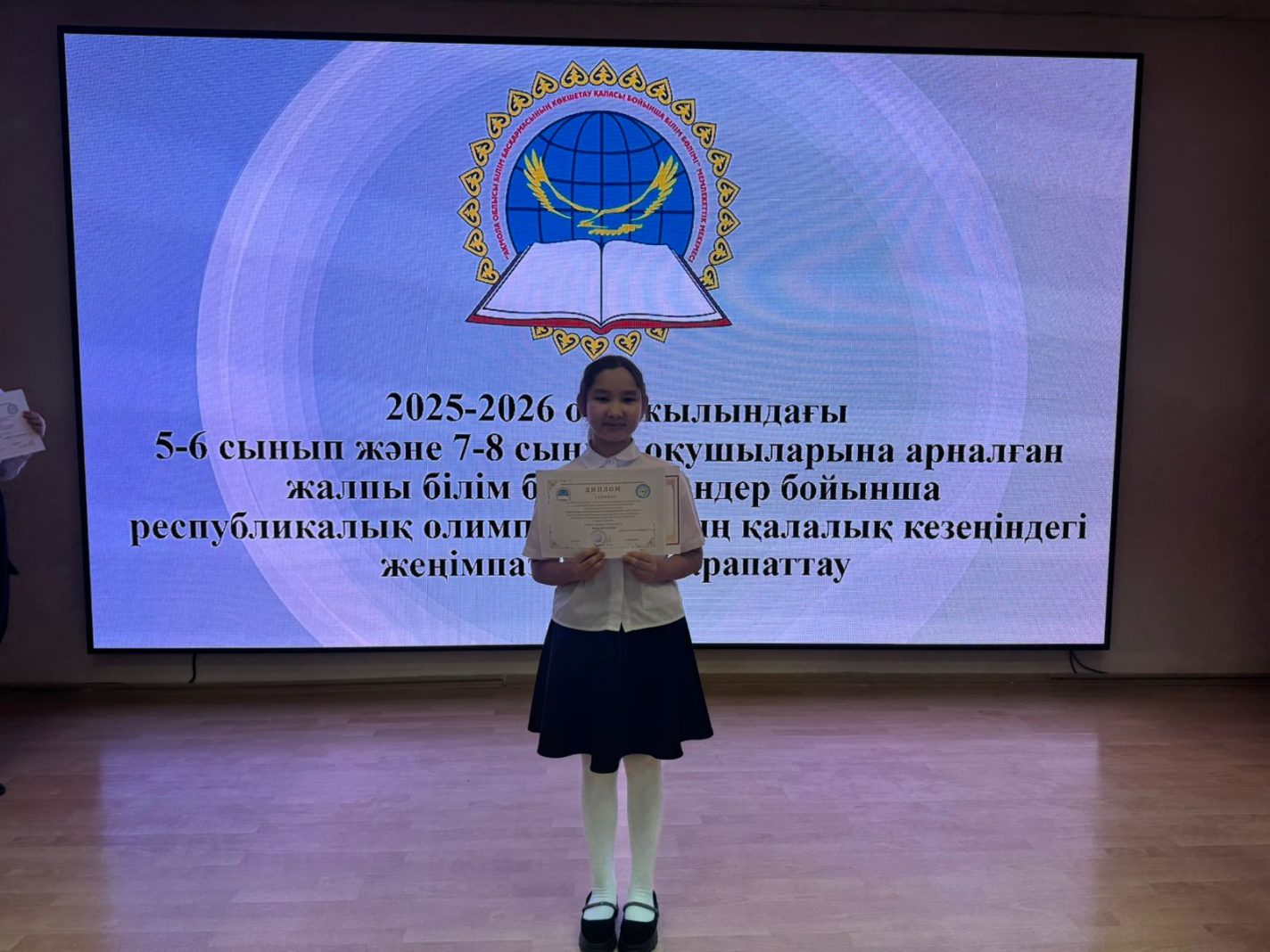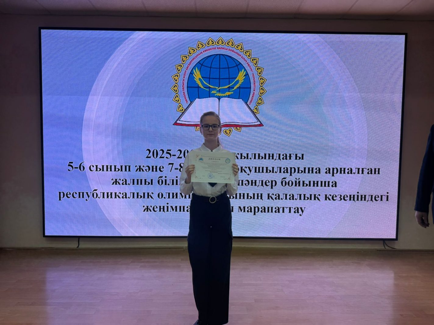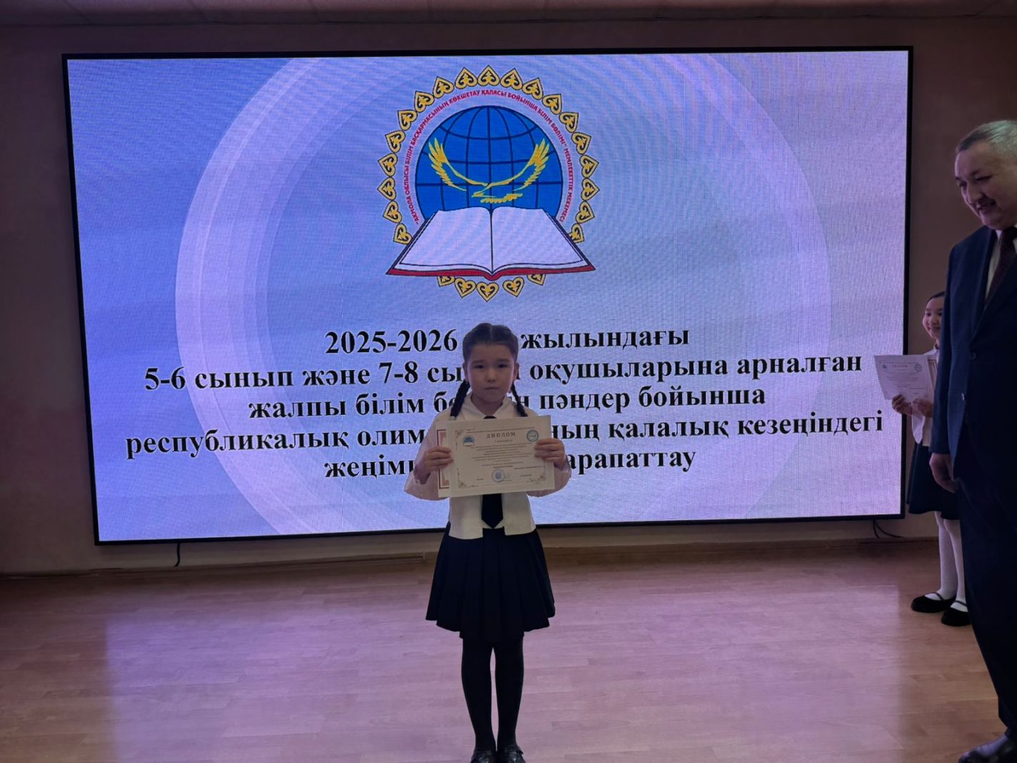2025 жылдың 10 желтоқсан күні №13 «ЭКОС» мектеп-гимназиясының базасында жалпы орта білім беретін пәндер бойынша 5-6, 7-8-сынып оқушыларына арналған республикалық олимпиаданың екінші (қалалық) кезеңінде I орын иеленген оқушыларды марапаттау рәсімі өтті. Аталған іс-шараға қалалық олимпиадада қазақ тілі және әдебиеті пәнінен I орынды иеленген 5 «А» сынып оқушысы Әубәкір Еркежан, орыс тілі пәнінен Еркен Айзере және информатика пәнінен 7 «В» сынып оқушысы Николаева Надежда қатысып, Көкшетау қаласы бойынша білім бөлімінің дипломдары мен қаржылай сертификаттармен марапатталды. Жетекшілері: Дильдабаева Эльмира Адикеримовна, Можебаева Тогжан Есимовна, Иконникова Анна Сергеевна. ҚҰТТЫҚТАЙМЫЗ!!!