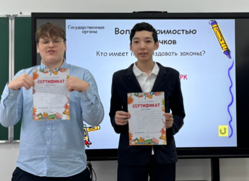 Игра прошла активно, интересно и познавательно. Ребята показали отличные знания, логику и умение мыслить как настоящие граждане, знающие свои права и уважающие закон. Учитель : АкжигитоваД.М